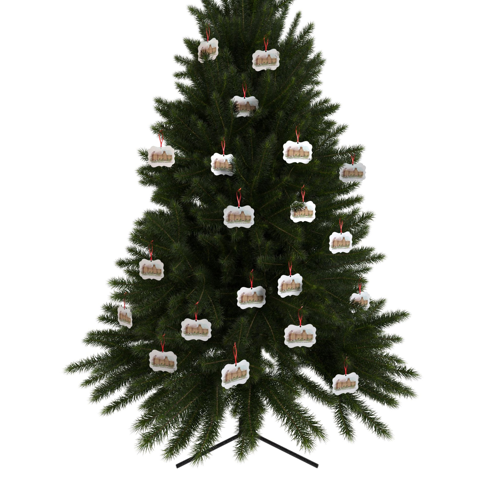 Spread cheer and decorating joy this year with these aluminum ornaments. Available in two shapes: scalloped corner, and medallion, these ornaments feature a one-sided print and brushed metal backing, and comes with a satin ribbon for hanging and a matte finish.